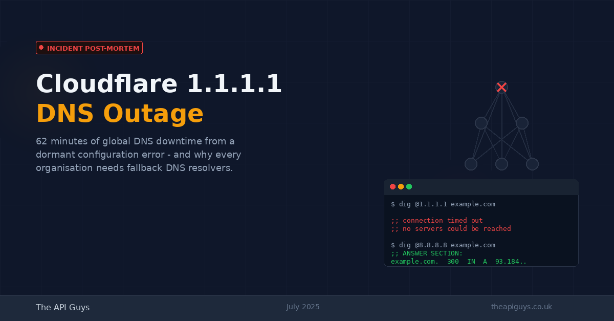 DNS - the Domain Name System - translates human-readable domain names like theapiguys.co.uk into the IP addresses that computers use to communicate. Every time you visit a website, make an API call, send an email or connect to any internet service, a DNS lookup happens first. If your configured DNS resolver is unavailable, none of those actions can complete.