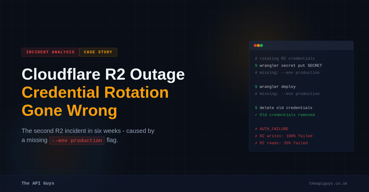 The problem on 21 March was a single missing CLI flag. The R2 engineering team used Cloudflare's own wrangler tool to deploy the fresh credentials. They ran wrangler secret put and wrangler deploy to push the new key pair - but they omitted --env production from both commands.