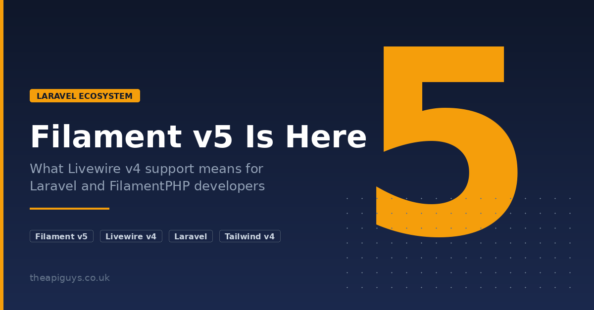 At The API Guys, we are fans of this approach. A major version that prioritises stability and ecosystem alignment over flashy new features shows maturity in the project. Filament v4 delivered the big feature work, and v5 ensures the framework is running on the best foundations available. The Filament team has consistently demonstrated good judgement in how they evolve the framework, and v5 is no exception.