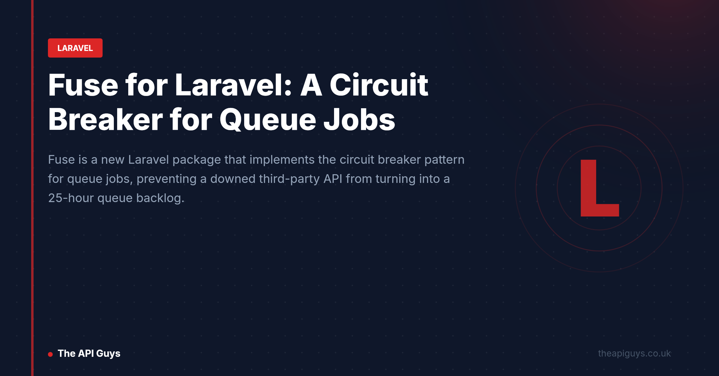 Fuse is a new Laravel package that addresses this with the circuit breaker pattern. After a configurable number of failures, the circuit opens. Jobs that would have hit the downed service fail instantly (in under a millisecond rather than after a 30-second timeout) and are delayed for automatic retry. When the service recovers, the circuit closes and the queue clears. The same 10,000-job scenario takes around 10 seconds to process once the circuit is protecting it.