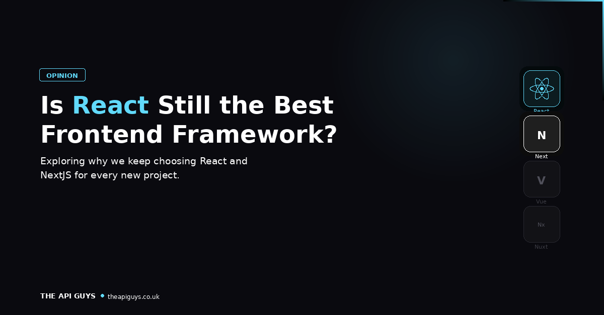For the work we do at The API Guys, where robust APIs meet polished frontends, NextJS is a natural fit. It handles routing, rendering strategies, and deployment concerns out of the box, letting us focus on building great user experiences on top of well-designed APIs.