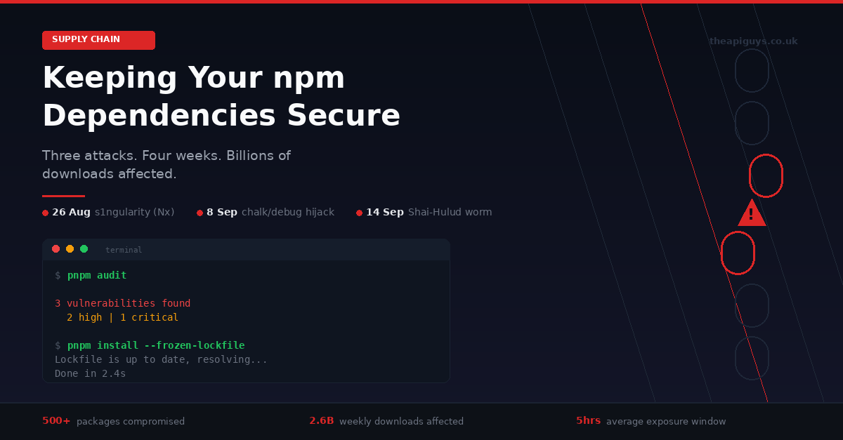 Keeping your server-side dependencies updated - your PHP versions, your Laravel framework, your operating system packages - remains essential. We covered that extensively in our post on why security patching is not a one-off task. But September has made it clear that your frontend dependencies demand the same level of attention.