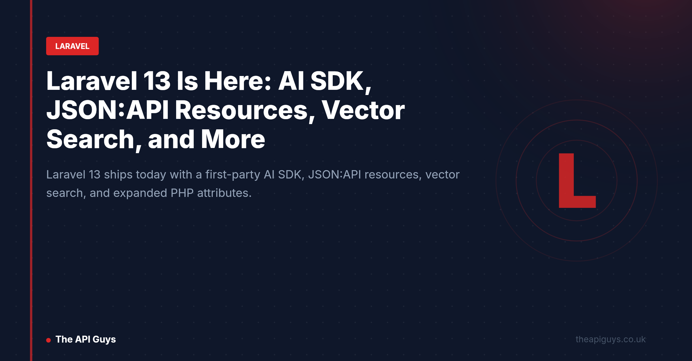 Laravel 13 is out today. It is a bigger release than it might first appear - the headline is a first-party AI SDK, but there are substantial additions for API developers too: native JSON:API resource support, semantic vector search in the query builder, centralised queue routing, and a continued expansion of PHP attribute support across the framework. Breaking changes are minimal by design.