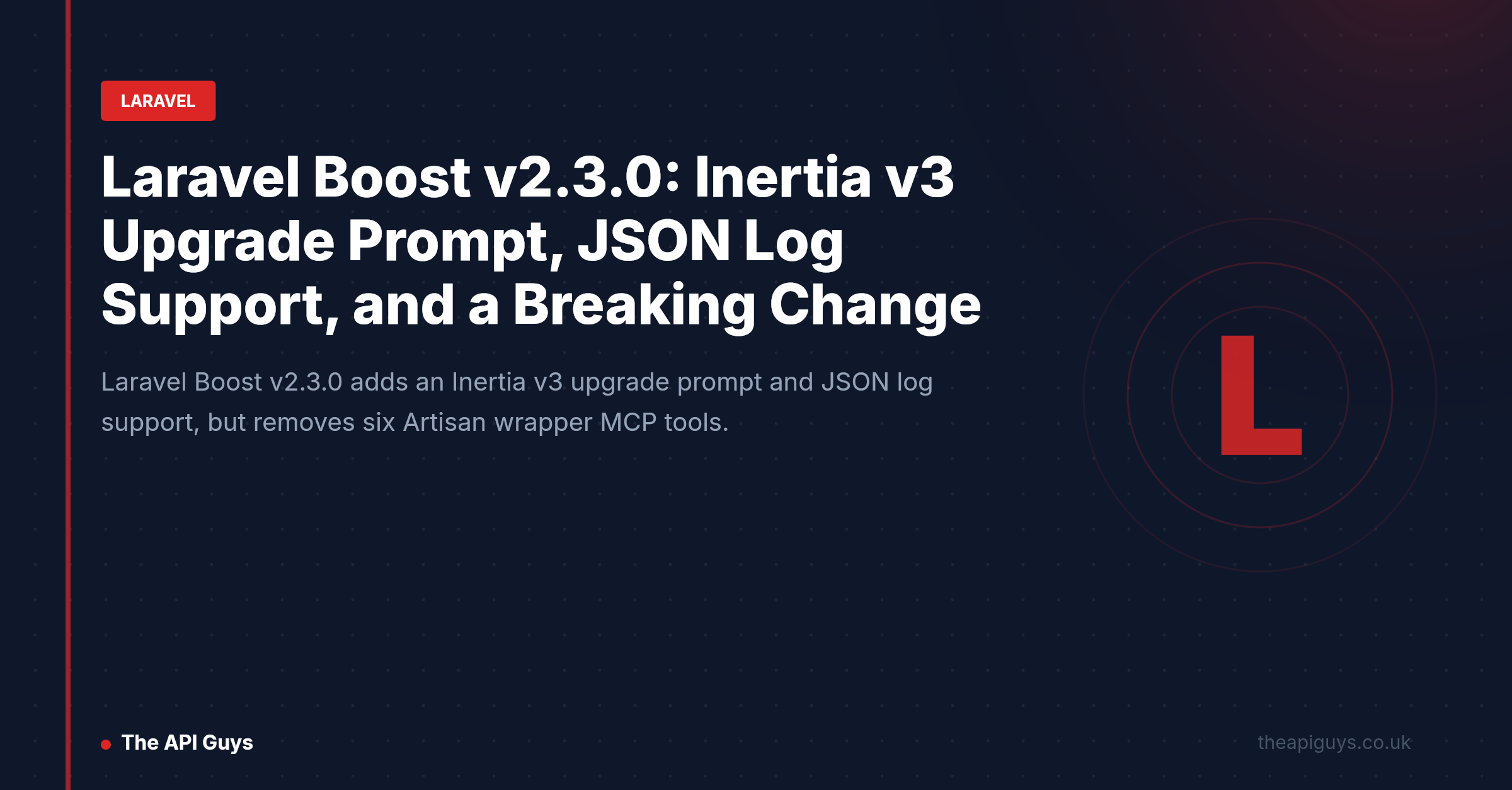 Laravel Boost v2.3.0 is out, bringing an Inertia v3 upgrade prompt, JSON-formatted log support, and a fix for PHP 8.4 stdout corruption in MCP responses. It also removes six Artisan wrapper MCP tools - a breaking change if your workflow depends on them.