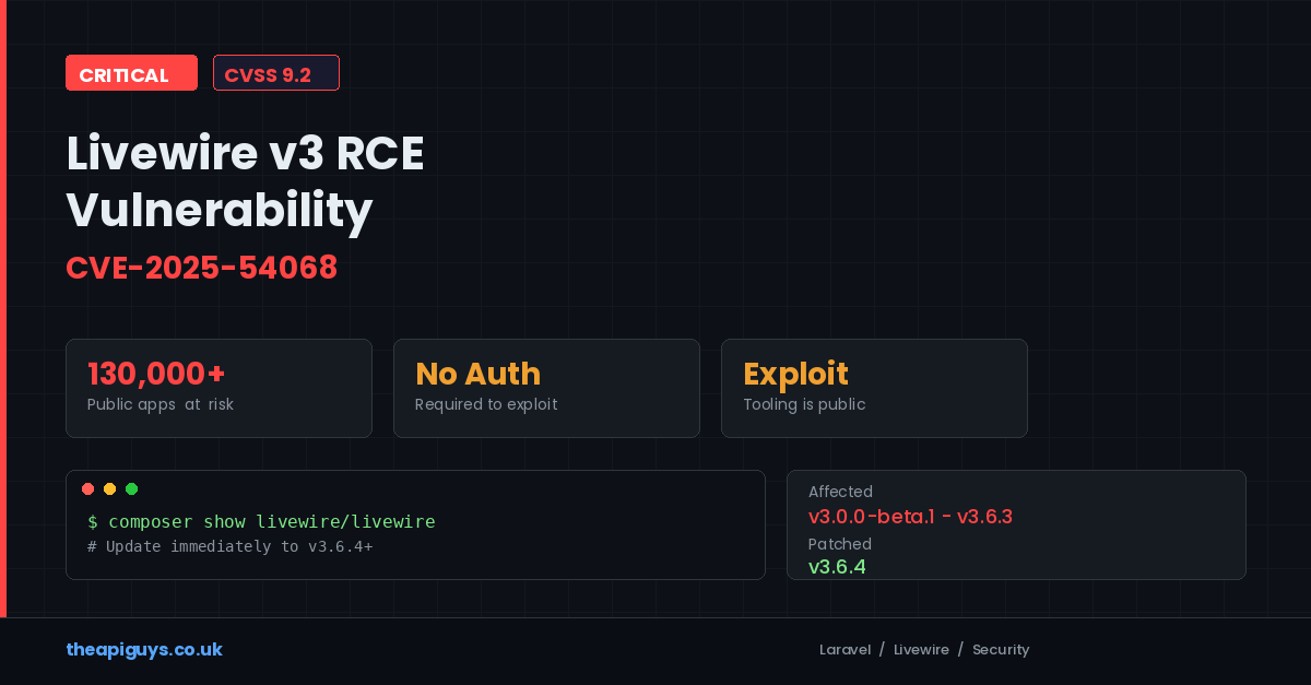 If you use Livewire v3, update to v3.6.4 today. Not this week. Not when you get around to it. Today. The exploit tooling is public, the vulnerability requires no authentication, and there are 130,000 potential targets. Attackers will be scanning for unpatched installations.
