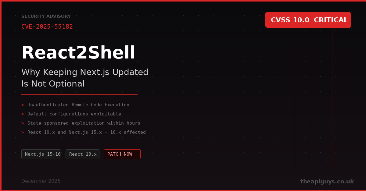 If you are running a Next.js application in production, the events of early December 2025 should serve as a wake-up call. A critical vulnerability dubbed React2Shell was disclosed on 3rd December, and within hours, state-sponsored threat groups were already exploiting it in the wild.
