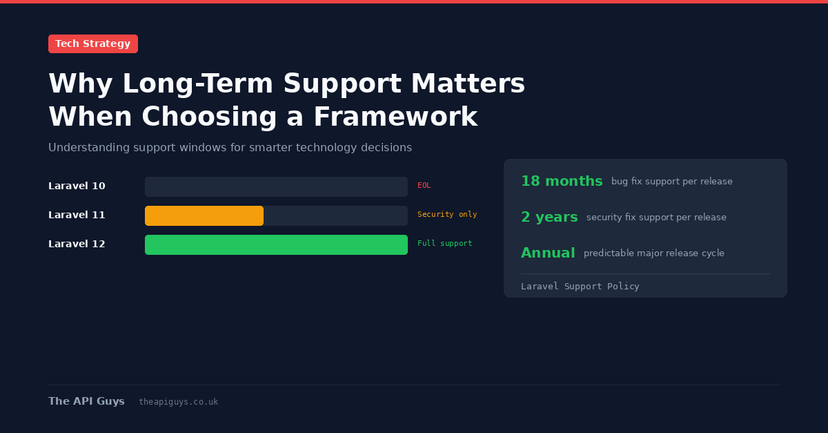 If you are making technology decisions for a business, the support policy behind a framework should be one of the first things you examine. It directly affects your maintenance costs, your security posture, and how much pressure your team will be under to upgrade on someone else's schedule.