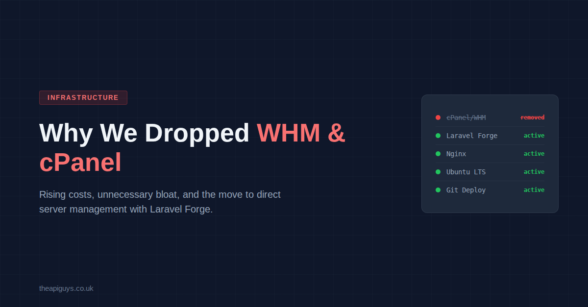 Lower costs. A Forge subscription costs a fraction of what we were paying in cPanel licences. The servers themselves are cheaper too, because we're not wasting resources running a control panel.