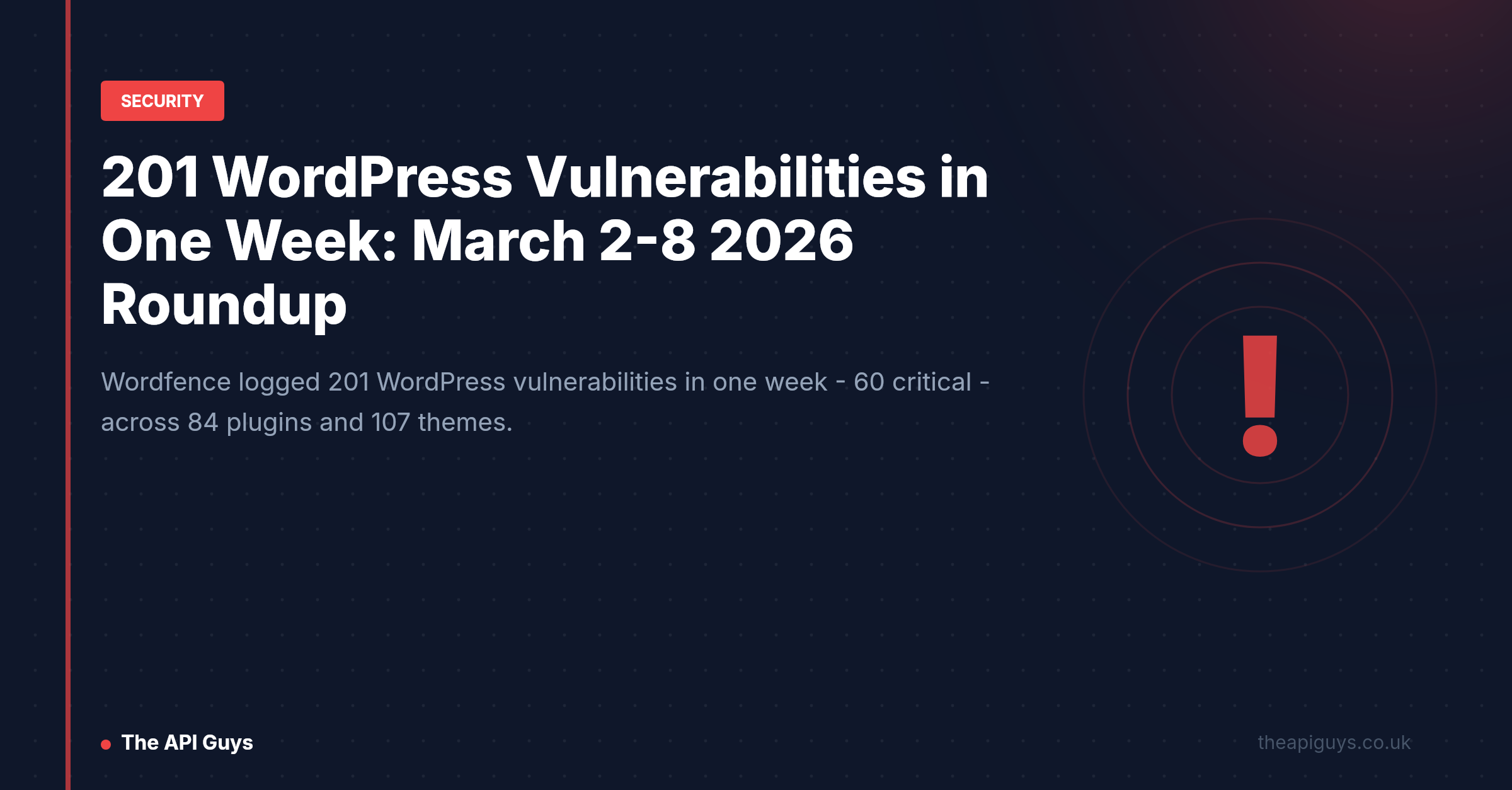 Wordfence's weekly WordPress vulnerability digest for 2-8 March 2026 logged 201 disclosed vulnerabilities across 84 plugins and 107 themes. Of those, 60 were rated critical severity. That is a significant volume for a single week - and it comes on top of several high-profile individual disclosures already covered this month, including the Ally plugin SQL injection and the WordPress core triple patch release.